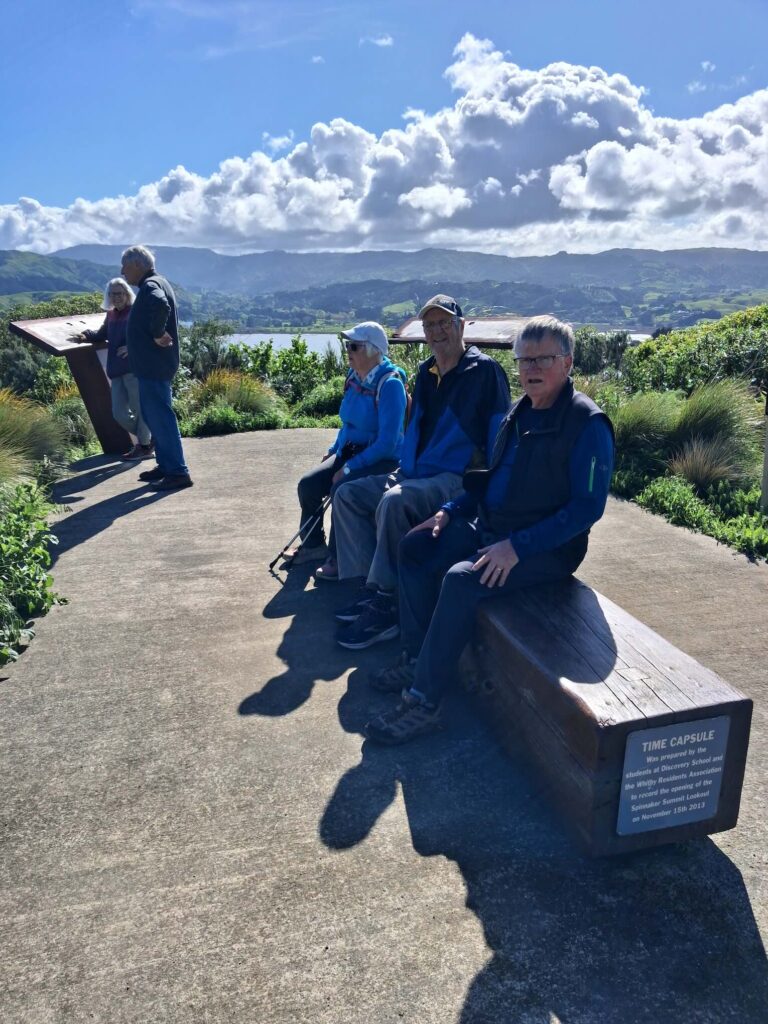 SSs: Thank you to Janet Tyson for the photo of the second group of SSs sitting at the Spinnaker Lookout. There are three seated members enjoying a well deserved break after the climb. I note that they are sitting on a site titled “Time Capsule” and I wonder whether they are waiting to be added or whether they have escaped after 12 years?? The second photo is courtesy of Rowena Rowe. Some good cloud formations in the backgrounds of both photos.