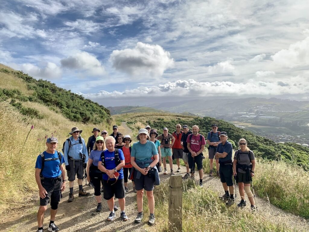 Friday’s walk was close to home with Gary Dick leading his team from Johnsonville into Churton Park and then up onto the Chippenham/Erlestoke track that we have walked many times.  But half-way along he ignored the “No public access beyond this point” sign and took the group onto the new track which is clearly visible from CP.  From there walkers headed down the new track to cross Ohariu Valley Road and then head up the new track (still a work in progress) and back into Johnsonville.  This new track is a northern extension of the Skyline walkway and is close to completion.  Thanks, yet again, to Hue Ng for the photo.