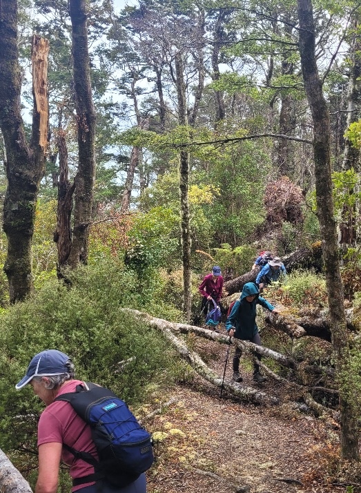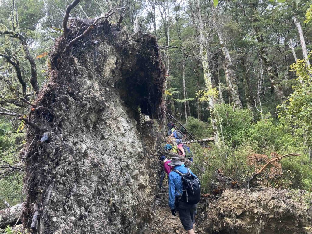 This week’s photo was taken by Graham Bentley on the Friday walk during the ascent from York Bay to the ridge. A young, flowering rata vine had survived the downing of the tree on which it was supported. Many trees had come down in the recent southerly storm – see photos below.