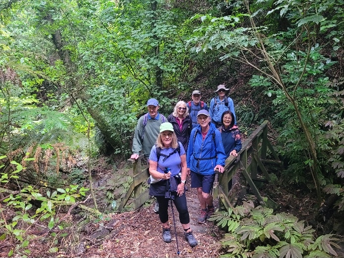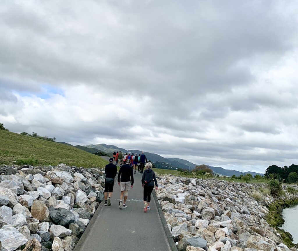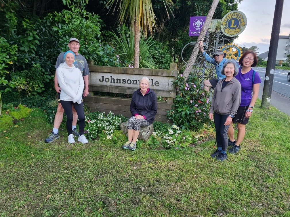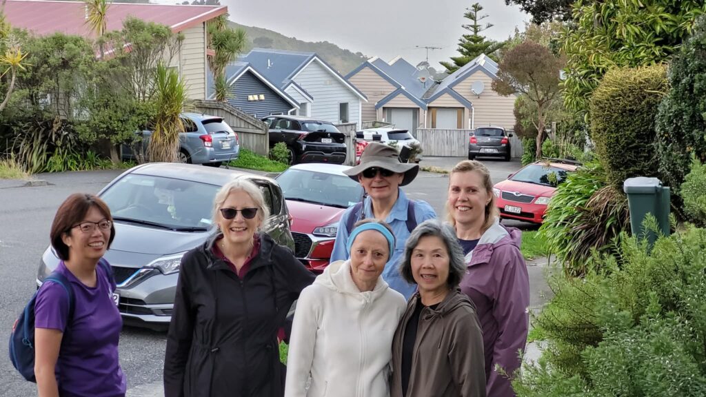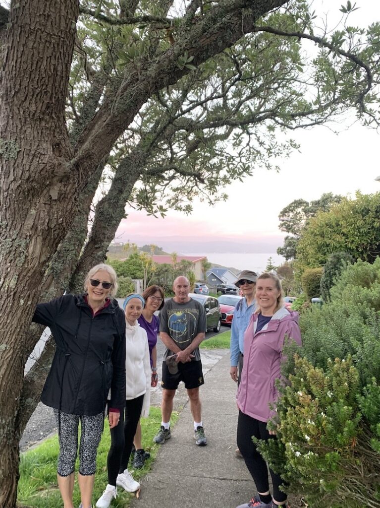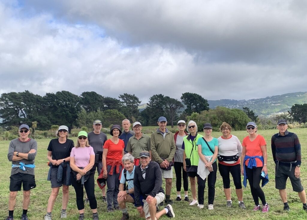As David has outlined, all three walks were completed this week. Wednesday’s photos reflect the groups and their surroundings at and away from Te Awa Kairangi/ Hutt River; Thursday’s walkers were out and about in Johnsonville/Broadmeadows; and the Friday team – still a bit depleted in numbers due to injuries and travel – were guided by Clint on various challenging bush tracks (see Russell’s definitions above!) between Lowry and York Bays and Wainuiomata. The Friday walkers also spent some time on footpaths, roads and walkways. They were also asked to leave a walkway under construction along Marine Drive – there was a temptation to leave a mark from CPCW in the newly poured concrete, but it was resisted!