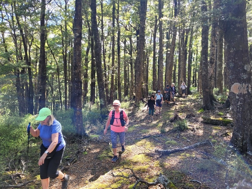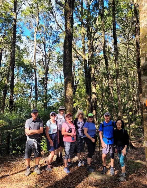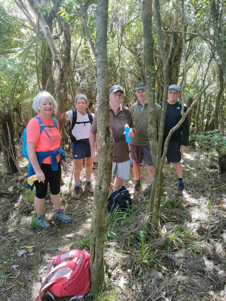 Clint Davis led Friday’s walkers out into the Remutaka Forest Park – out on the Orongorongo Trail, then up the Cattle Ridge Track and back home via the Butcher Track. This walk was in memory of Ron Butterworth, a member of the walking group, who sadly collapsed and died while walking up the Butcher Track in 2020. The two groups each paused at the cairn placed beside the track to remember Ron.