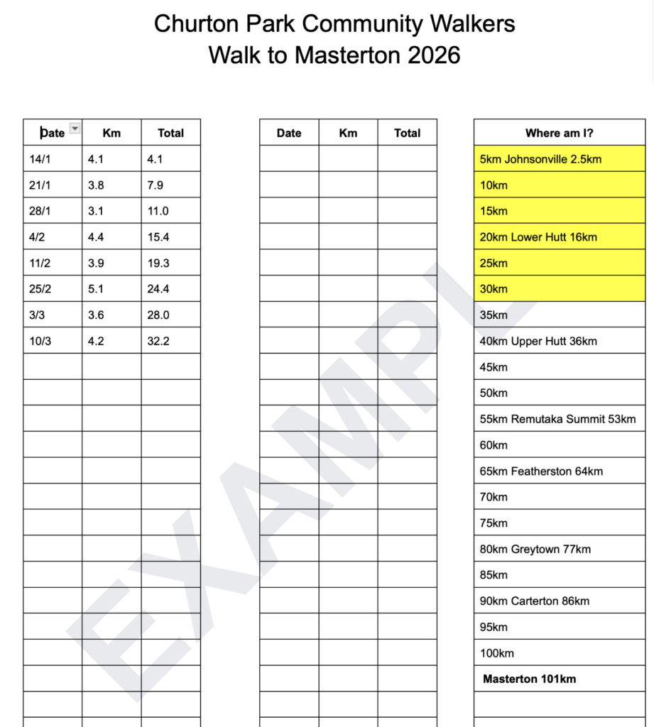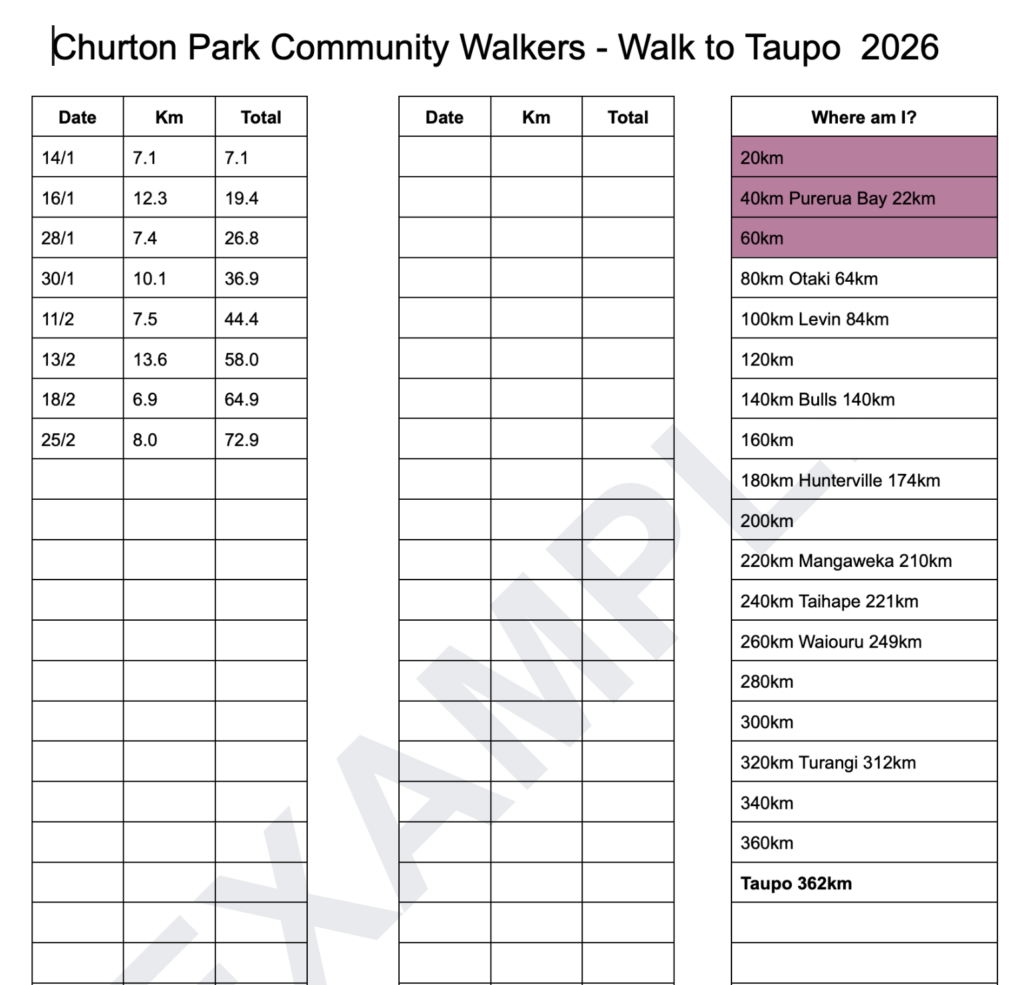 At the lunch I introduced the idea of keeping a personal walking log for 2026, totalling the distance walked week by week with the Churton Park Community Walkers. The log allows members to record their progress on an imaginary route of their choosing, selecting a destination within the North Island. The destinations are Masterton (101km), Palmerston North (143km), Whanganui (184km), Napier (307km), Taupo (362km) or Hamilton (512km). Participants will be able to share their progress from time to time with a pin on a North Island map. There will also be some extravagant spot prizes. This is not a competition or a race, but simply an opportunity to observe and enjoy each other’s walking achievements during the year. If you did not pick up a blank log chart at the lunch please email me (David.Pegram.nz@gmail.com) and I will print one out for you on card or send you an electronic copy. See examples below.